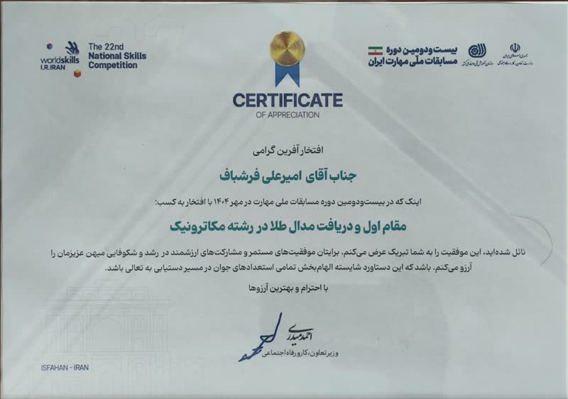 عملکرد درخشان این دانشجوی توانمند دانشگاه ملی مهارت در مرحله نهایی مسابقات، که با داوری دقیق و فنی متخصصان سازمان فنی و حرفهای کشور همراه بود، نشاندهنده توان علمی، مهارتی و خلاقیت بالای ایشان است.